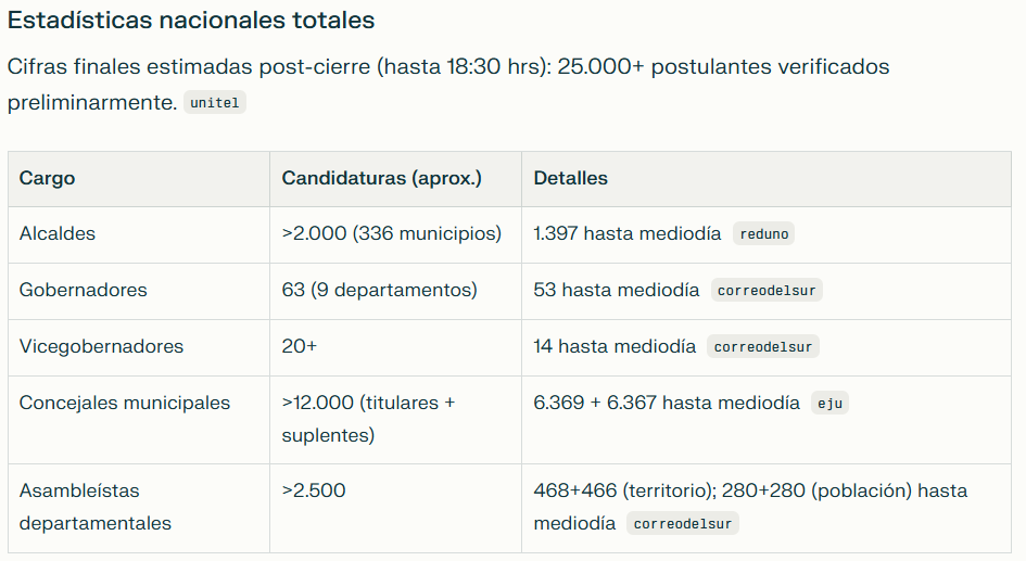 El proceso de inscripción de candidaturas para las elecciones subnacionales del 22 de marzo de 2026 concluyó este 26 de diciembre con más de 25.000 postulaciones registradas a nivel nacional, de acuerdo con un reporte preliminar del Tribunal Supremo Electoral (TSE) difundido al cierre del plazo.