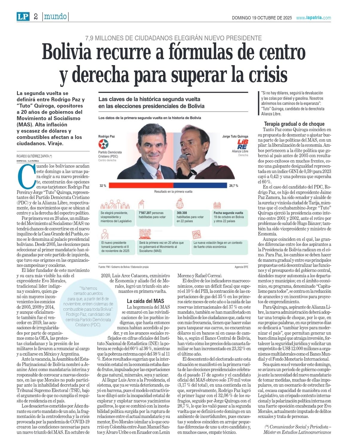 La segunda vuelta se definirá entre Rodrigo Paz y “Tuto” Quiroga, opositores a 20 años de gobiernos del Movimiento al Socialismo (MAS). Alta inflación y escasez de dólares y combustibles afectan a los ciudadanos. Viraje.