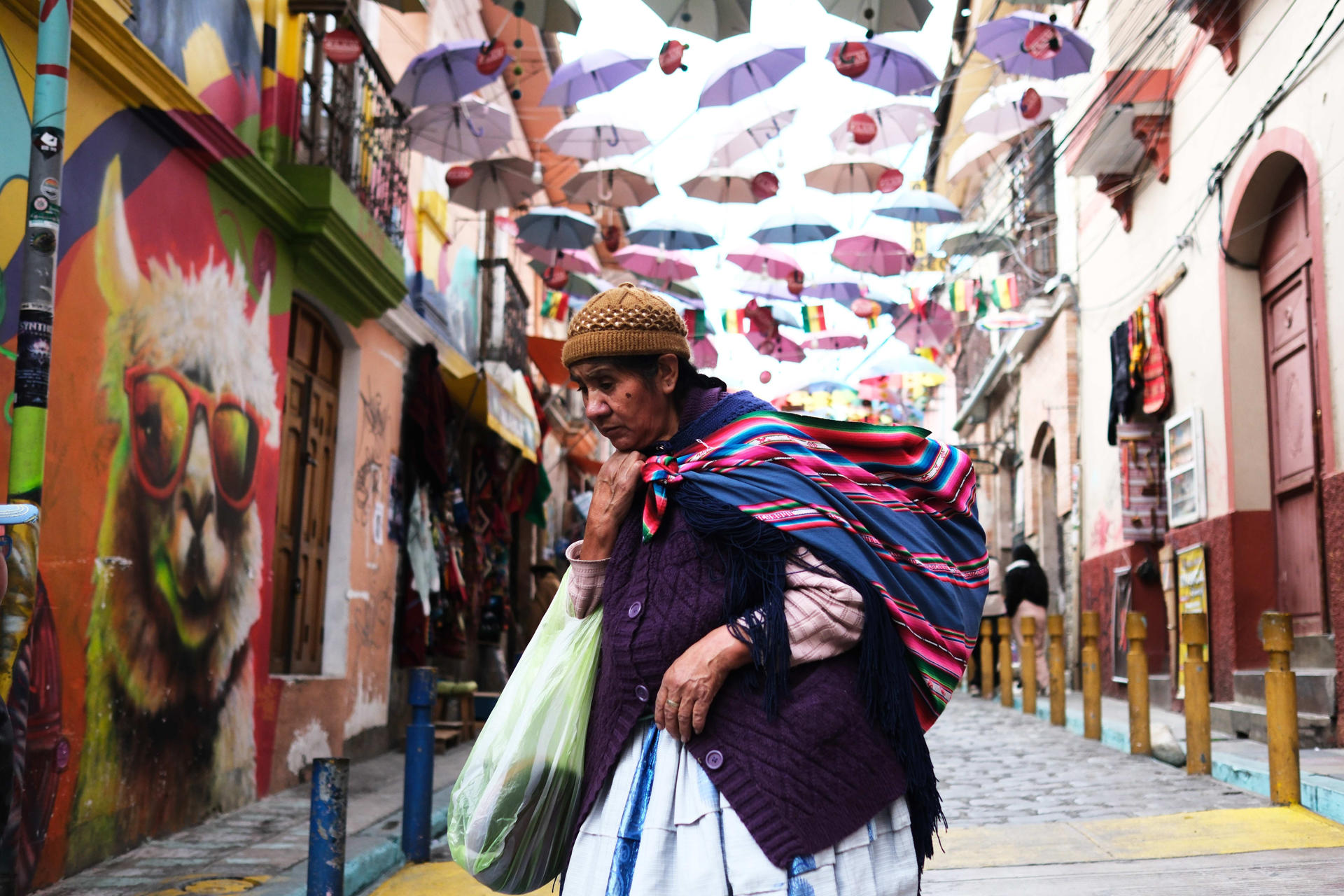 Una mujer aimara camina por una calle turística este sábado en La Paz (Bolivia). EFE/Luis Gandarillas
