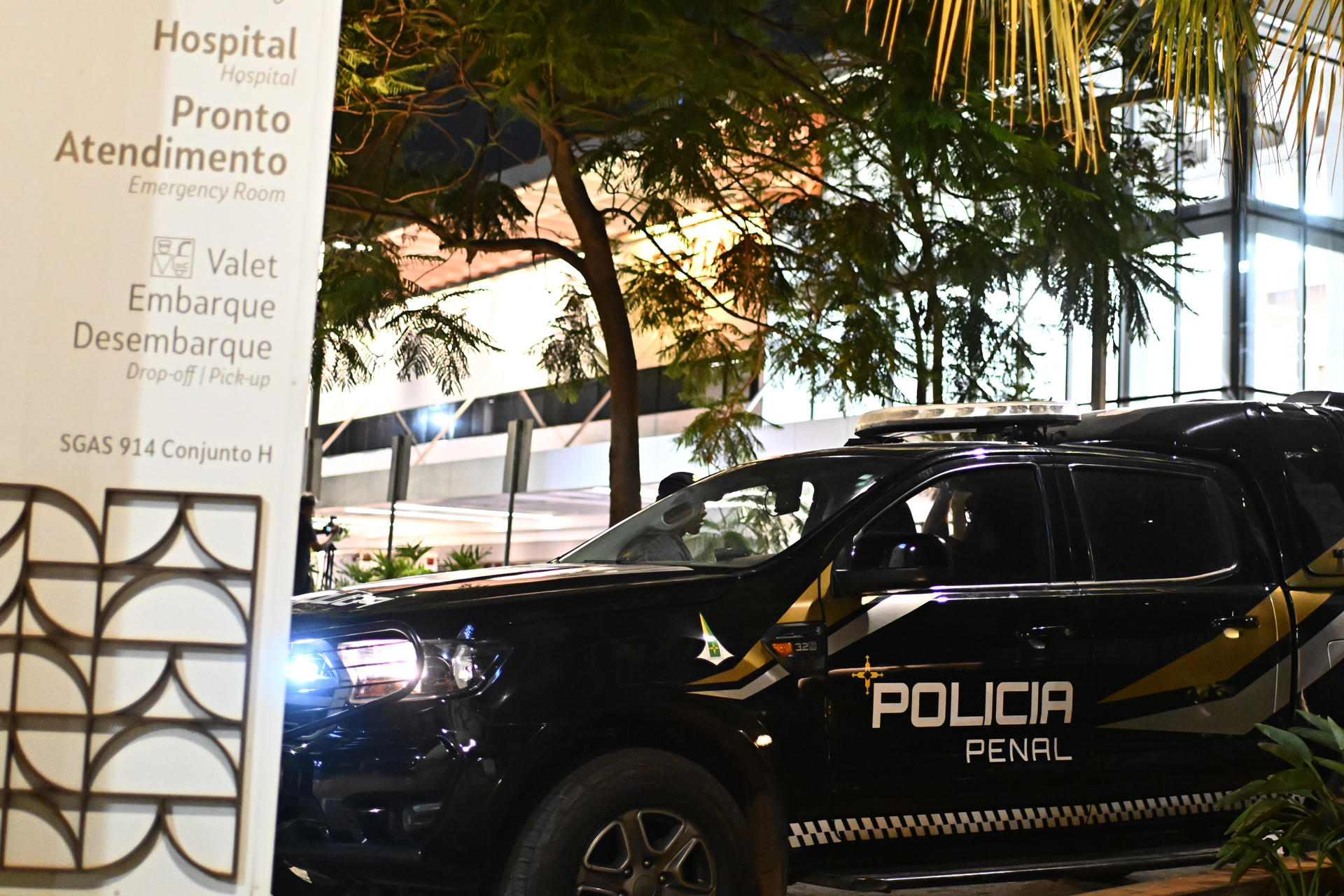 Fotografía que muestra un vehículo de la Policía Penal este 17 de septiembre de 2025, frente al hospital DF Star en Brasilia (Brasil). EFE/ Andre Borges