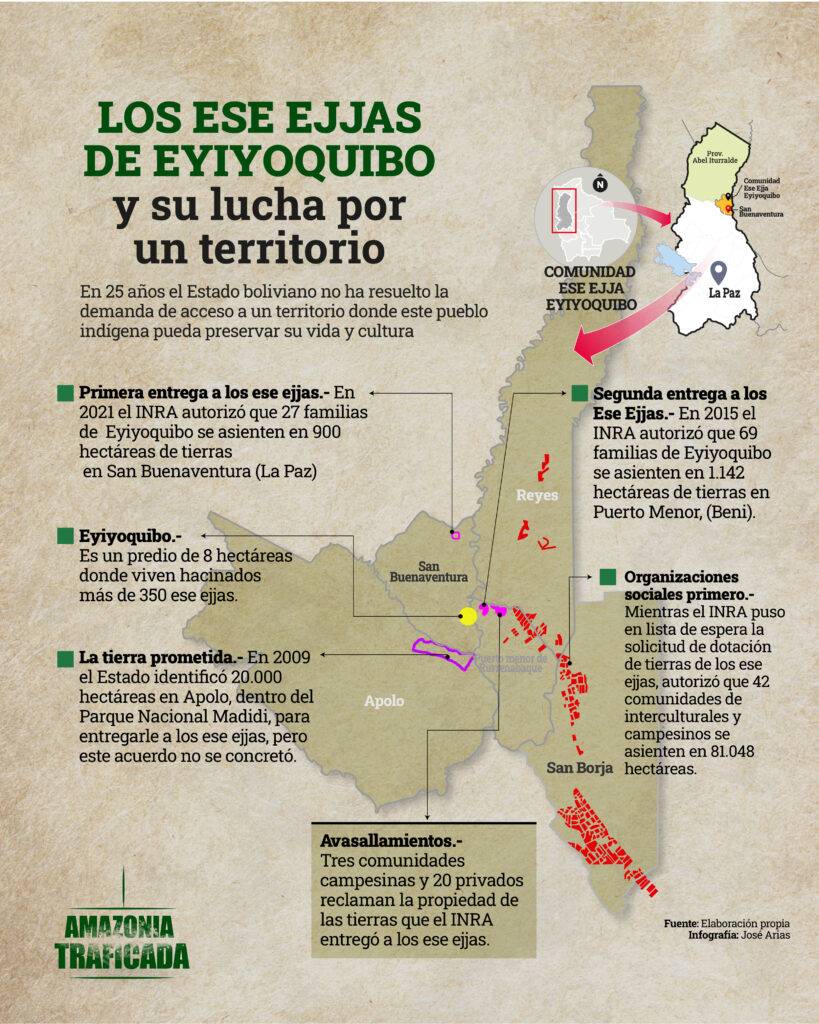 - En 25 años el Estado boliviano no sólo ha sido incapaz de garantizar al Pueblo Indígena Ese Ejja de Eyiyoquibo el acceso a un territorio ancestral, sino que ahora los enfrenta con avasalladores de tierras.