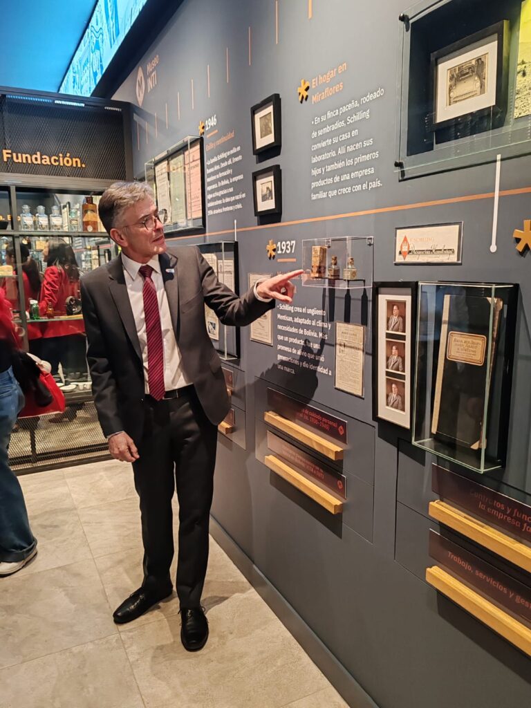 Dirk Schilling, presidente del directorio de Droguería INTI, no recorre el museo como un ejecutivo. Lo hace como alguien que creció dentro de la empresa.