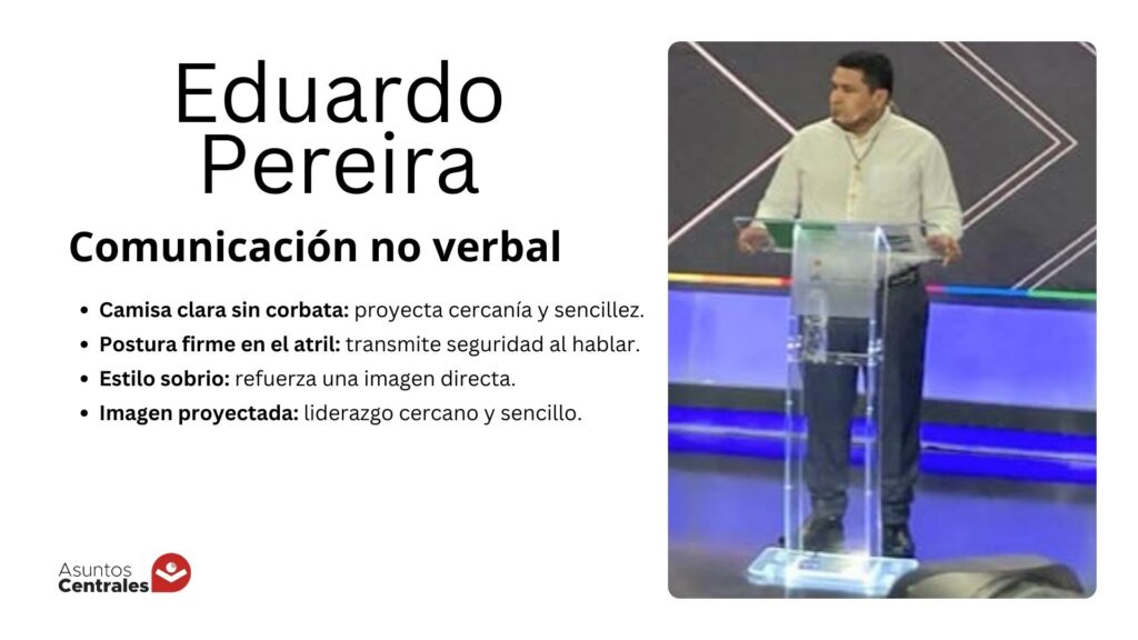 En contraste, varios candidatos optaron por un estilo más cercano, marcado por camisas sin corbata. En esta línea se ubicaron Julio César Torrez (Nueva Generación Patriótica), Mauricio Quezada (Partido Demócrata Cristiano) y Eduardo Pereira (Unidos por los Pueblos), una elección que suele buscar transmitir proximidad con el ciudadano y una imagen menos rígida que la del político tradicional.