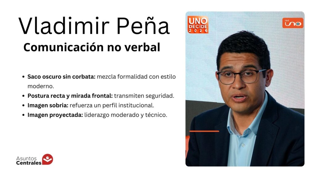 Un tercer formato observado fue el estilo híbrido, que combina elementos formales con una apariencia más moderna. En esta categoría se ubica Vladimir Peña (Fuerza y Esperanza), quien participó con saco oscuro pero sin corbata, una imagen que mezcla institucionalidad con cercanía.
