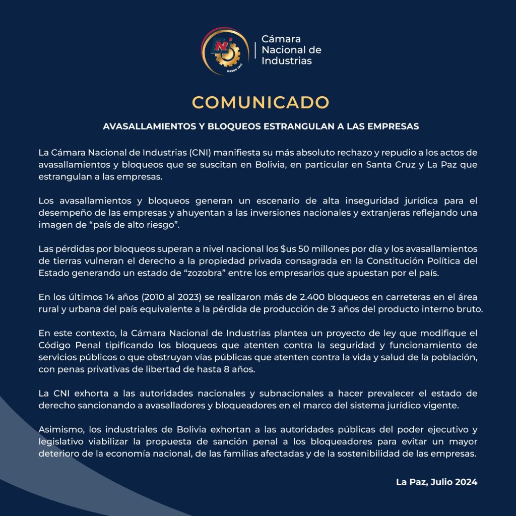 La Cámara Nacional de Industrias (CNI) se declaró en emergencia por la aparición de nuevos casos de avasallamiento de tierras que golpean a productores de diferentes regiones, en particular a Santa Cruz, al igual que los constantes bloqueos que se dan en las carreteras del país. Según la CNI, este escenario implica una alta inseguridad jurídica que ahuyenta inversiones.