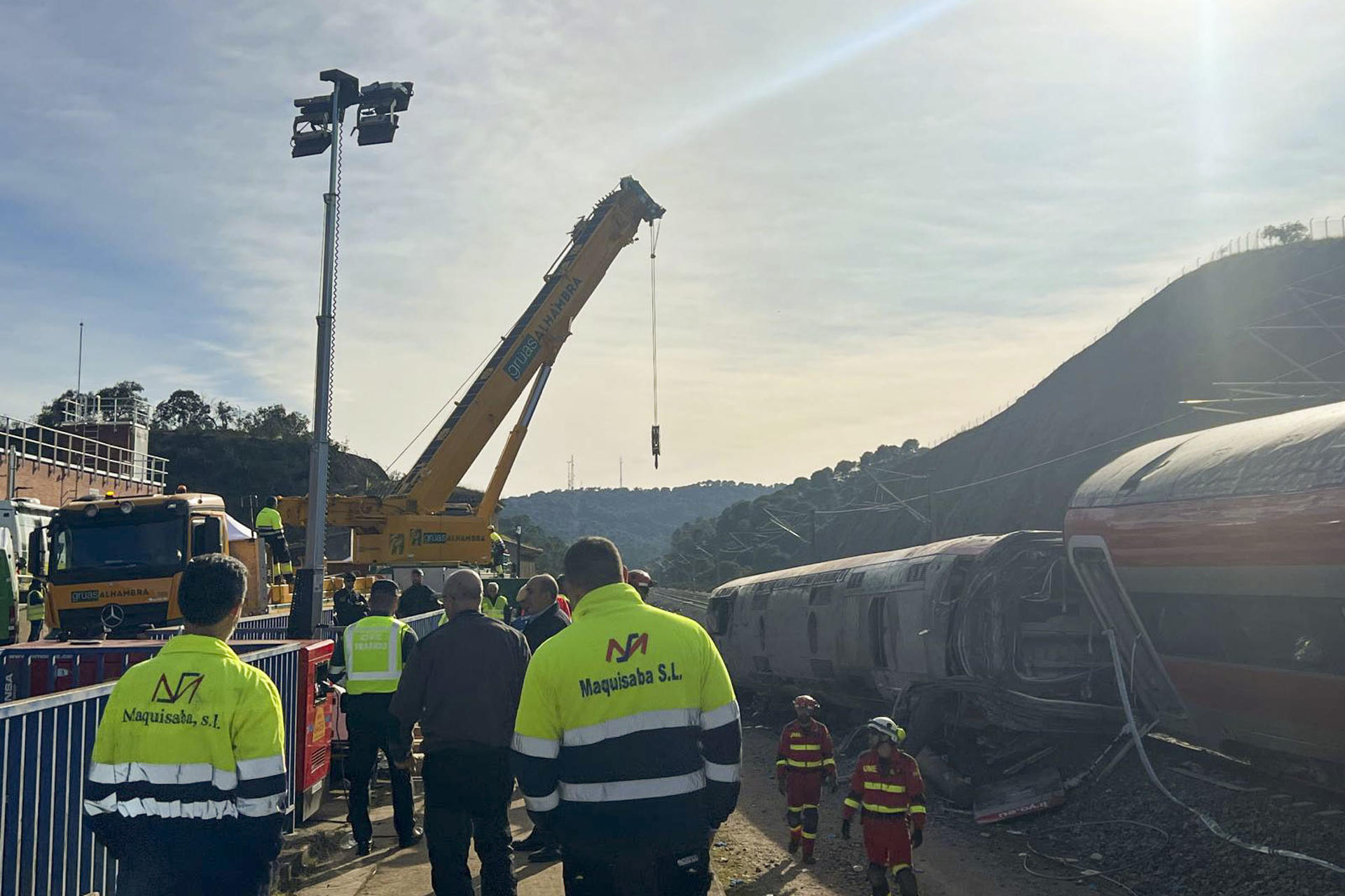 Las grandes grúas que trabajan sobre el terreno consiguieron levantar y desplazar los vagones de uno de los trenes que estaban volcados tras el accidente en el sur de España, por lo que se abre una vía para que la maquinaria pesada pueda llegar hasta el otro tren afectado y levantar los vagones destrozados.