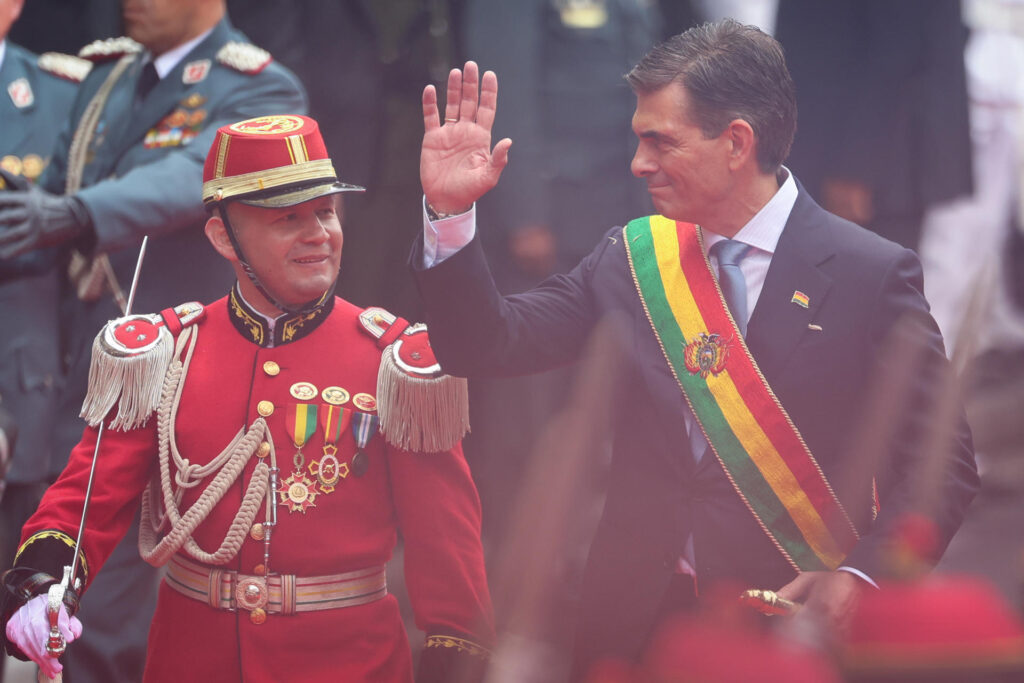 AME7008. LA PAZ (BOLIVIA), 08/11/2025.- El presidente de Bolivia, Rodrigo Paz Pereira (d), saluda este sábado, en La Paz (Bolivia). Paz Pereira tomó juramento como el nuevo presidente de Bolivia para un periodo de cinco años, abriendo un nuevo ciclo político y económico en el país suramericano después de 20 años de la izquierda en el poder. EFE/ Juan Ignacio Roncoroni
