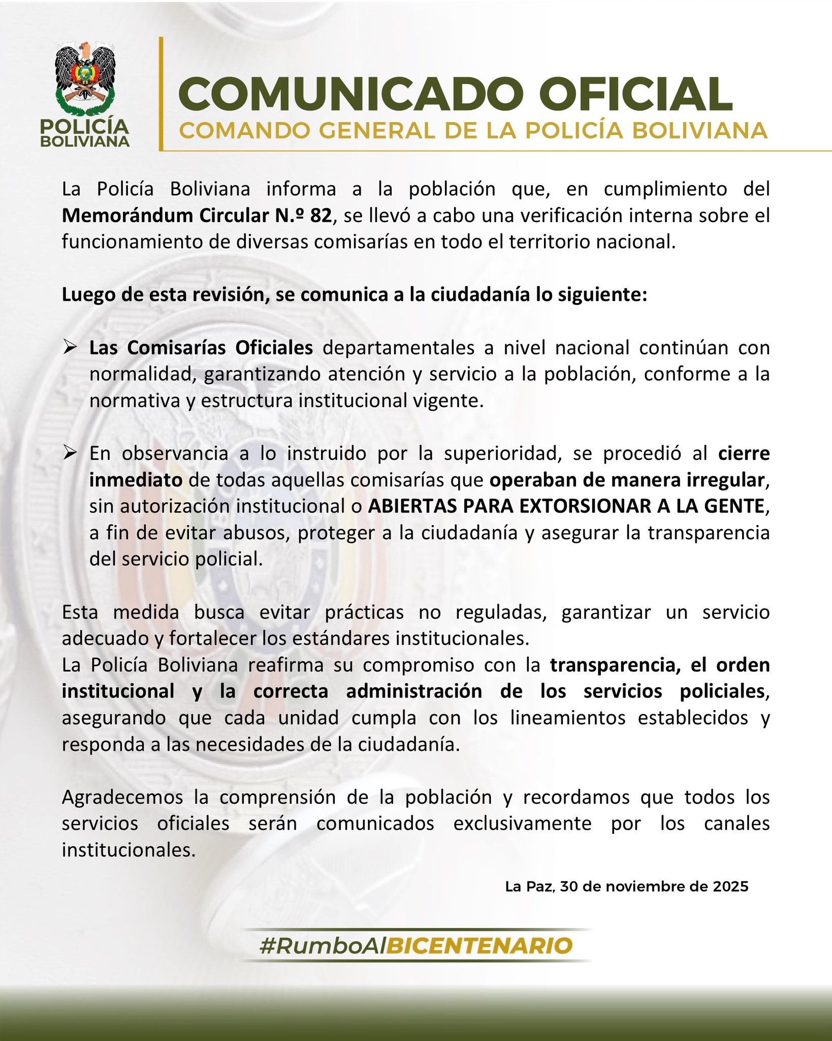 La Policía Boliviana aclaró hoy detalles sobre el cierre de comisarías que “operaban de manera irregular, sin autorización institucional o abiertas para extorsionar a la ciudadanía”, en el marco del Memorándum Circular N.º 82 y medidas recientes impulsadas por el nuevo comandante general, Mirko Sokol, enviada el sábado.