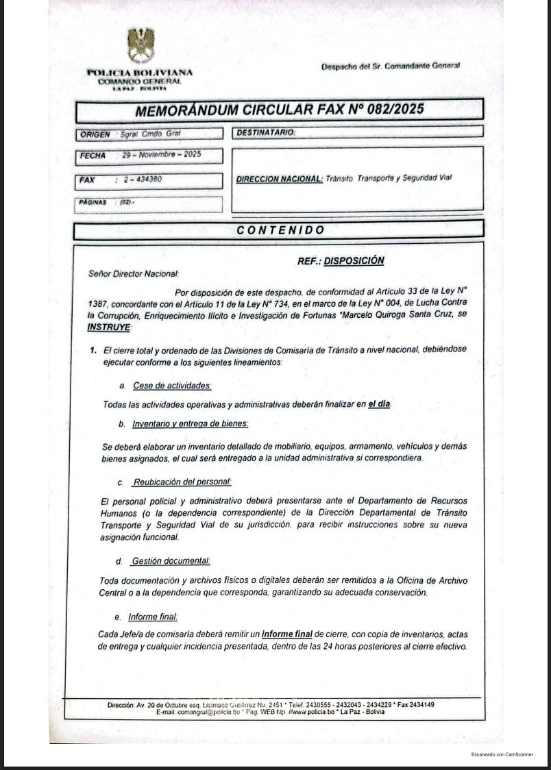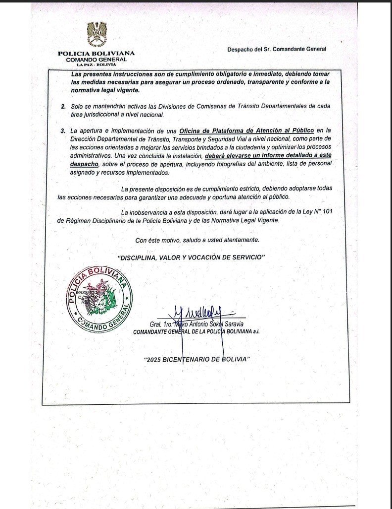 El nuevo comandante general de la Policía Boliviana, Mirko Sokol Saravia, ordenó el cierre inmediato y definitivo de todas las divisiones de comisarías de Tránsito en el país, como parte de una medida institucional para enfrentar hechos de corrupción.