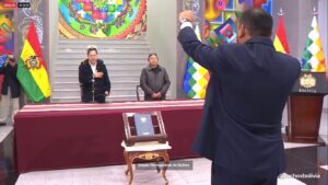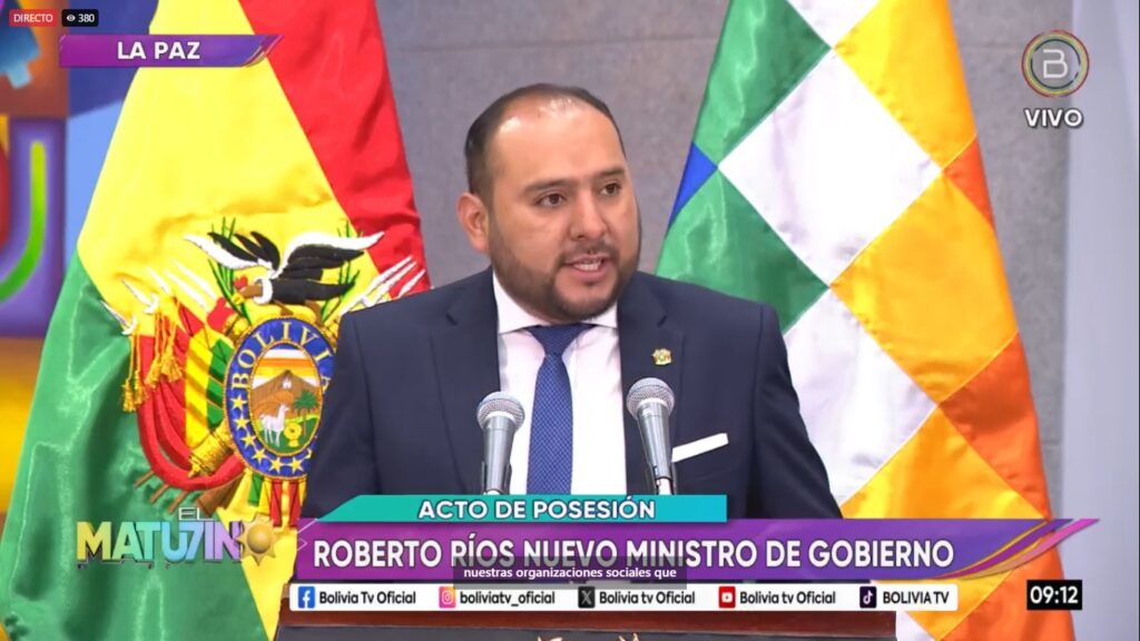 El presidente Luis Arce posesionó esta mañana a Roberto Ríos como nuevo ministro de Gobierno, en reemplazo de Eduardo del Castillo, quien ahora es el postulante a la Presidencia por el MAS-IPSP junto al dirigente campesino Milán Berna.