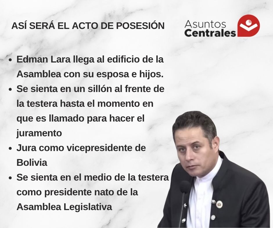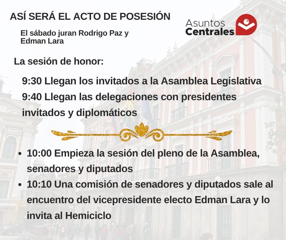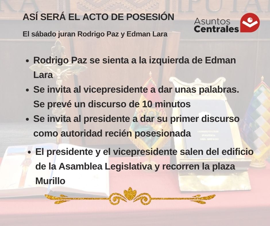Una vez concluido el acto, el nuevo mandatario se ubicará a la izquierda del vicepresidente. Lara ofrecerá unas palabras iniciales —con un discurso estimado de diez minutos— y luego Paz dirigirá su primer mensaje a la nación como jefe de Estado.