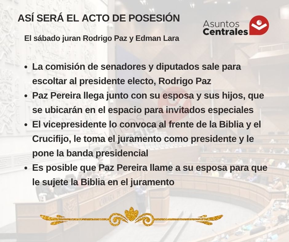 Posteriormente, la comisión legislativa escoltará al presidente electo, Rodrigo Paz Pereira, quien llegará también junto a su familia. Frente a la Biblia y el Crucifijo, Paz prestará juramento como presidente del Estado Plurinacional. Se prevé que su esposa participe sosteniendo la Biblia durante la ceremonia.