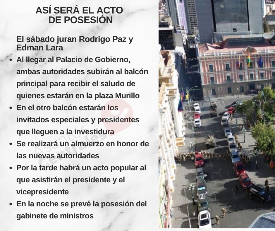 Este sábado, Bolivia vivirá una jornada de actos solemnes y simbólicos para la transmisión de mando. Rodrigo Paz Pereira y Edman Lara jurarán como presidente y vicepresidente del Estado en una ceremonia que combinará protocolo, y tradición.