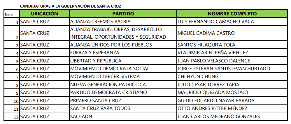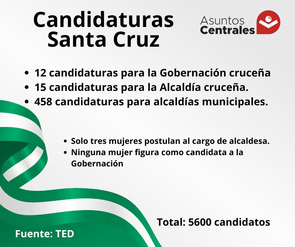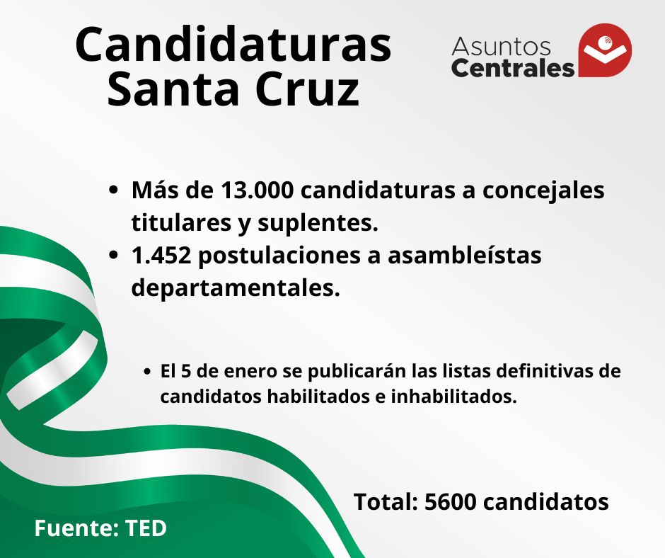 En Santa Cruz, el TED local informó que se registraron aproximadamente 5.600 candidaturas en diferentes cargos, presentadas por 184 organizaciones políticas. Entre ellas, se incluyen 12 candidaturas para la Gobernación y 458 para alcaldías municipales, lo que convierte al departamento en una de las regiones con mayor participación electoral del país.
