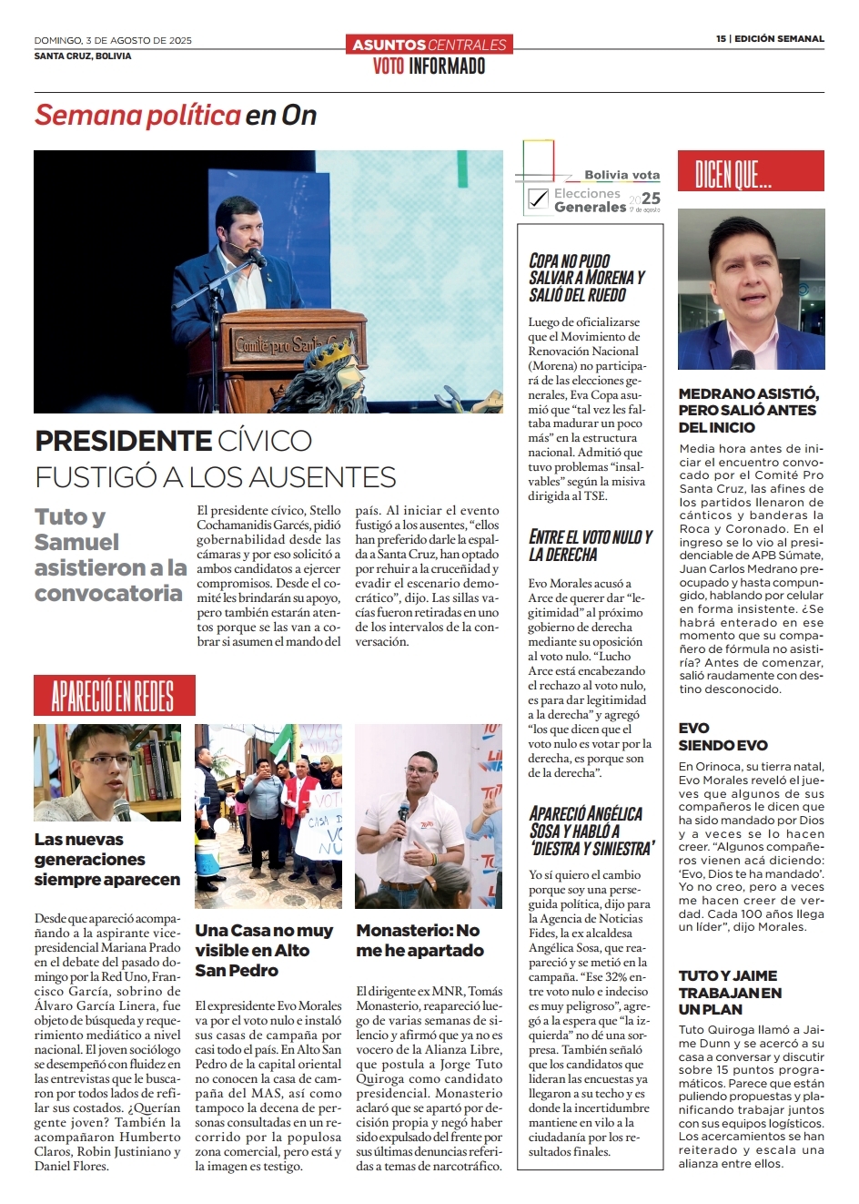El presidente cívico, Stello Cochamanidis Garcés, pidió gobernabilidad desde las cámaras y por eso solicitó a ambos candidatos a ejercer compromisos. Desde el comité les brindarán su apoyo, pero también estarán atentos porque se las van a cobrar si asumen el mando del país. Al iniciar el evento fustigó a los ausentes, “ellos han preferido darle la espalda a Santa Cruz, han optado por rehuir a la cruceñidad y evadir el escenario democrático”, dijo. Las sillas vacías fueron retiradas en uno de los intervalos de la conversación.