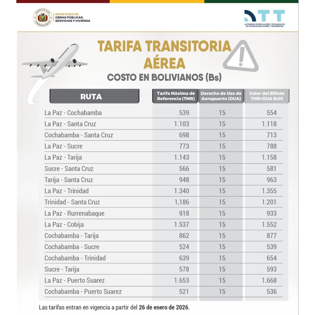 La Autoridad de Regulación y Fiscalización de Telecomunicaciones y Transportes (ATT) aprobó el ajuste provisional de las Tarifas Máximas de Referencia (TMR) para el Servicio Público de Transporte Aéreo de pasajeros en Bolivia.
