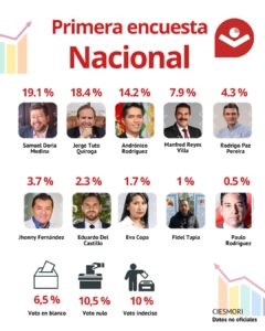 La primera encuesta nacional de intención de voto realizada por Ipsos CIESMORI, a 77 días de las elecciones generales del 17 de agosto, muestra una contienda muy reñida entre tres candidatos, que dominan en ocho de los nueve departamentos del país. Según la primera encuesta nacional de intención de voto realizada por Ipsos CIESMORI, Samuel Doria Medina (Unidad), Jorge Tuto Quiroga (Libre) y Andrónico Rodríguez (Alianza Popular) concentran la preferencia electoral, aunque ninguno de ellos alcanza el 20% a nivel nacional.