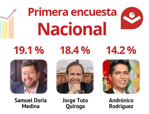 Doria Medina lidera con un 19,1% de intención de voto, seguido de cerca por Tuto Quiroga con el 18,4%. En tercer lugar se encuentra Andrónico Rodríguez con un 14,2%. Más rezagado, en cuarto puesto, aparece Manfred Reyes Villa (APB-Súmate) con el 7,9%, mientras que el resto de los candidatos no supera el 5%.